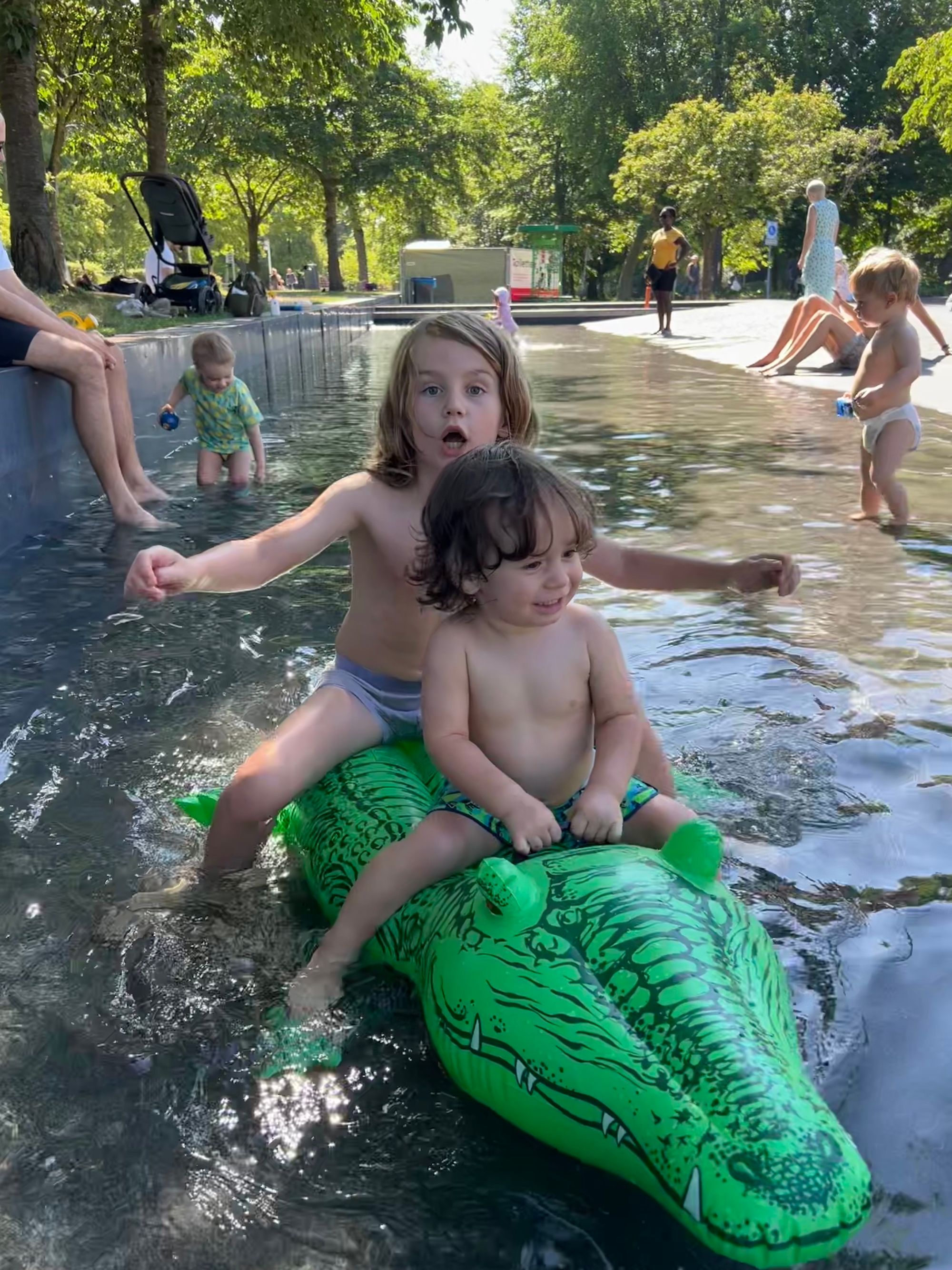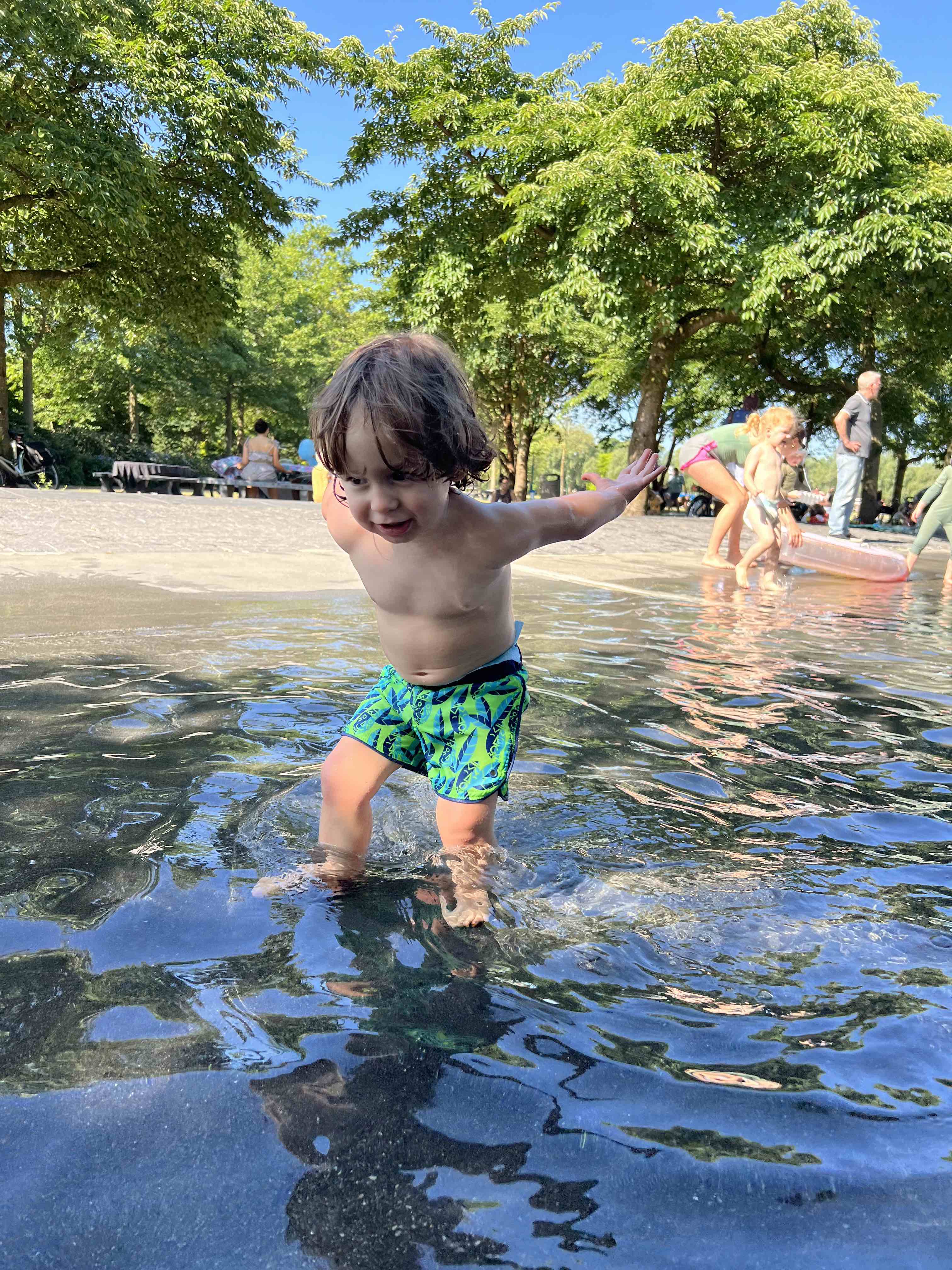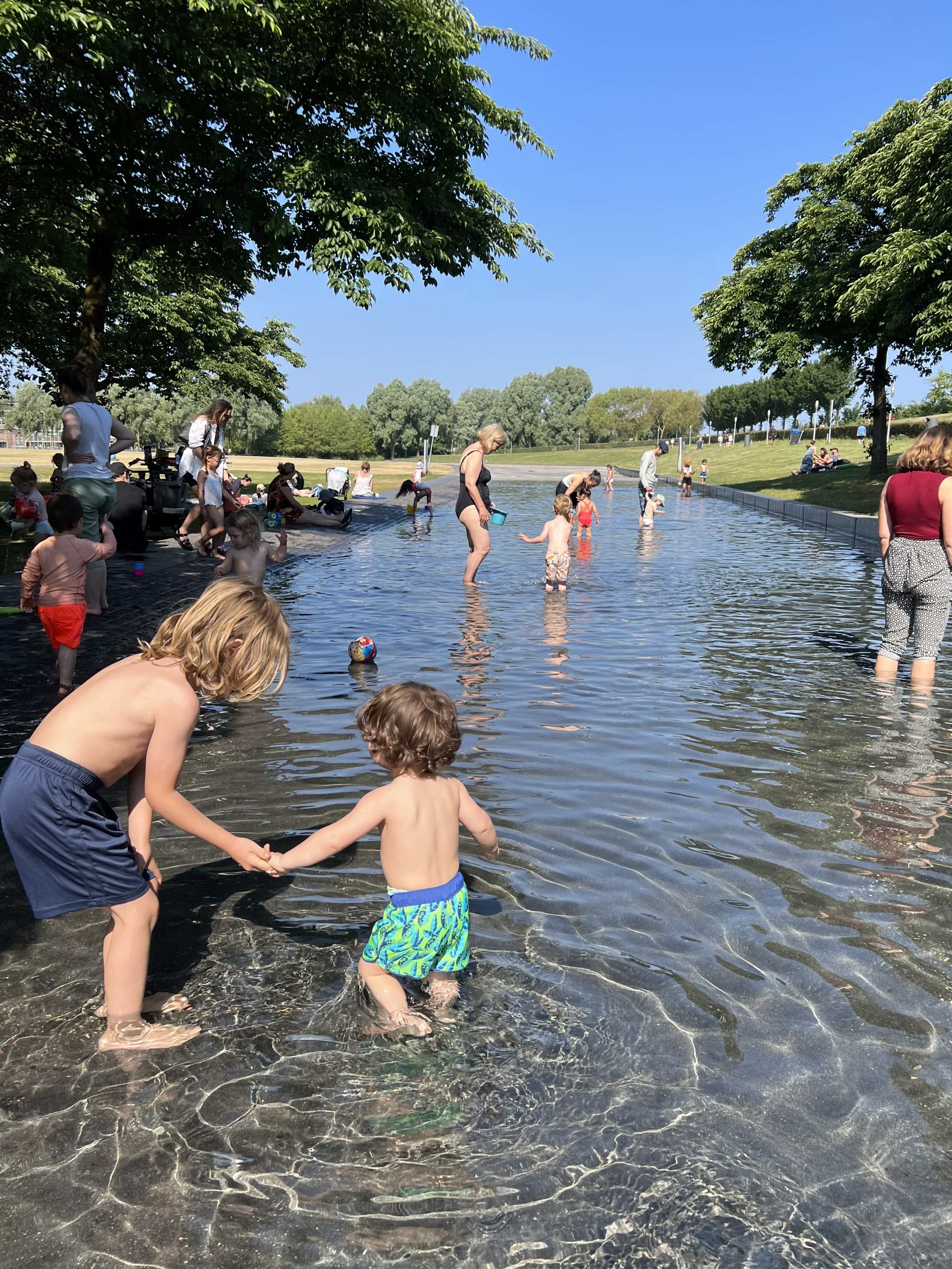 We've found it less crowded and chaotic as the big circular kids pools in Vondelpark, Amsterdamse Bos, Noord etc. And there's nice grassy shady spots for parents to set-up picnic blankets overlooking the pool.